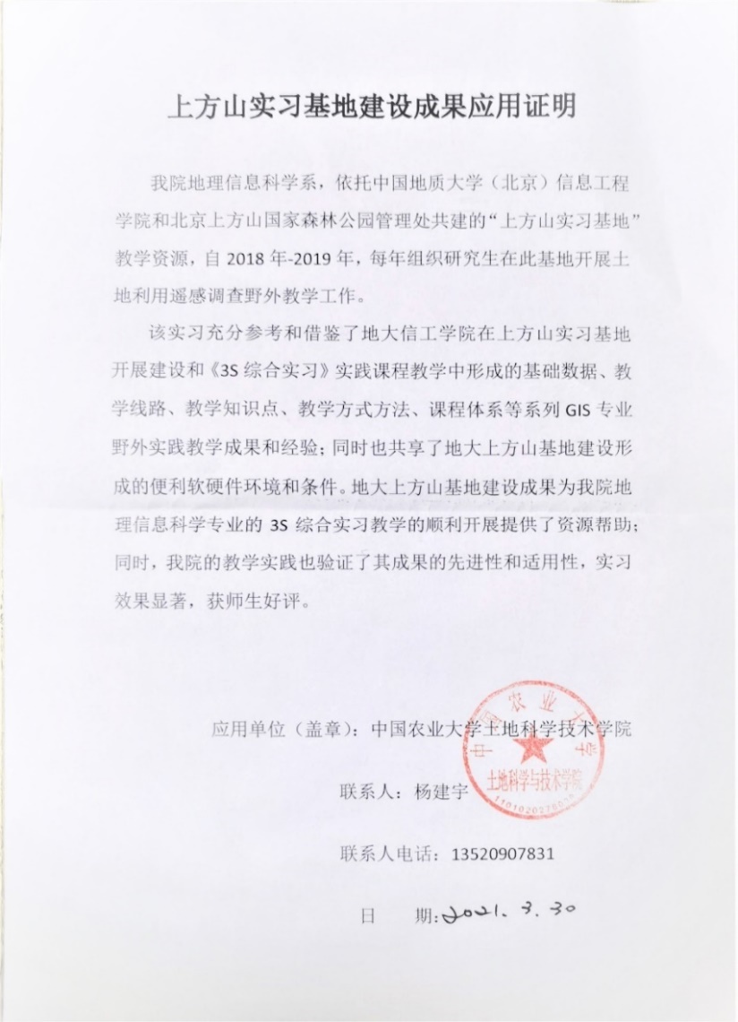 名称 | 上方山实习基地建设成果应用证明 | ||
