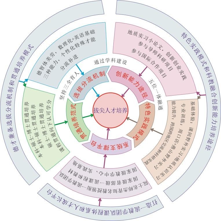 育人理念创新。坚持三全育人,对标国际地质学拔尖人才培养体制和成长规律, 以满足地质学国际发展和国家对拔尖人才的重大需求。通过 211 工程、一流学科的长期探索、建设和实践,以面向国际的一流科学研究带动教学,以培养学生创新能力为引领,构建“五位一体”的人才培养体系。在科学素质培养基础上,通过动态的人才选拔和分流,以贯通培养范式引导学生个性发展和潜力挖掘,培养个性化科学创新能力,满足了地质学发展对多元领军人才的迫切需求,实现了“个性化、高端化、国际化”的人才培养理念创新。