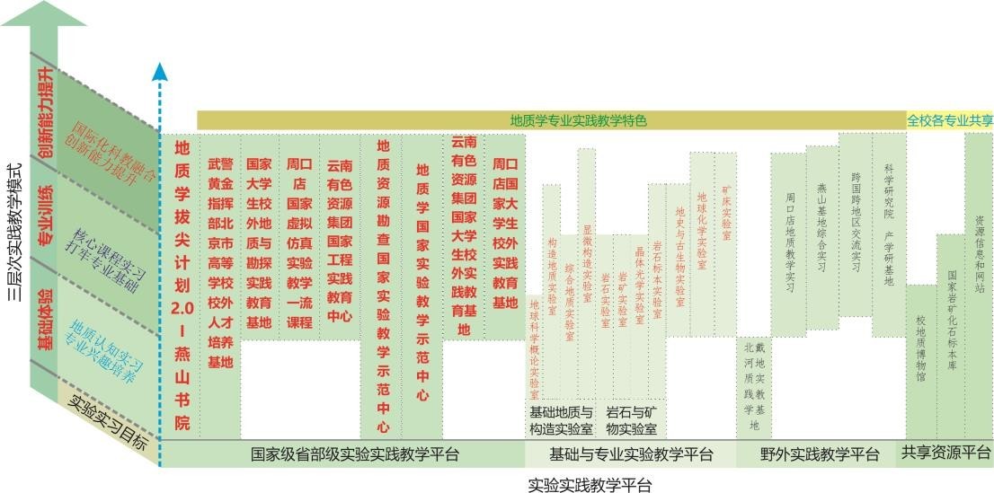 三层次实践教学与高水平科研相结合,建设了国家级和省部级系列实践教学平台,实现沉浸式和交互式学习,获批国家地质学拔尖计划 2.0(燕山书院)(图 2)。