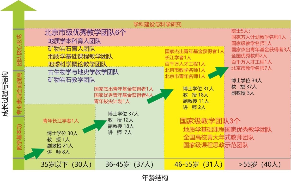 教学团队社会影响显著:充分发挥国家“211”工程、国家一流学科(A+)和国家一流专业的优势,先后获 1 个国家级优秀教学团队、1 个全国黄大年式教师团队、1 个国家级课程思政教学团队,6 个北京市级优秀教学团队和育人团队。团队中现有中科院院士 5 名、杰青、优青等 14 名,获国家级教学名师 1 人、国家万人计划教学名师 1 名、李四光地质科学奖 3 名,全国优秀教师 2 人,其它人才称号 16 名(附件11);每年与兄弟院校开展联合交流和野外调查,至今已经超过 26 次,交流模式为多所高校广泛采纳、借鉴(附件 12);给 50 余家单位进行授课,介绍地质学学科前沿 100 多次,组织建成世界地质公园 10 余个,服务社会具有引领作用。