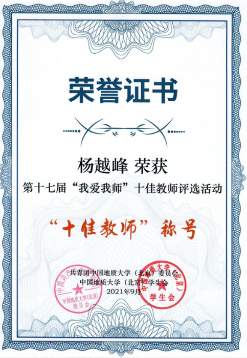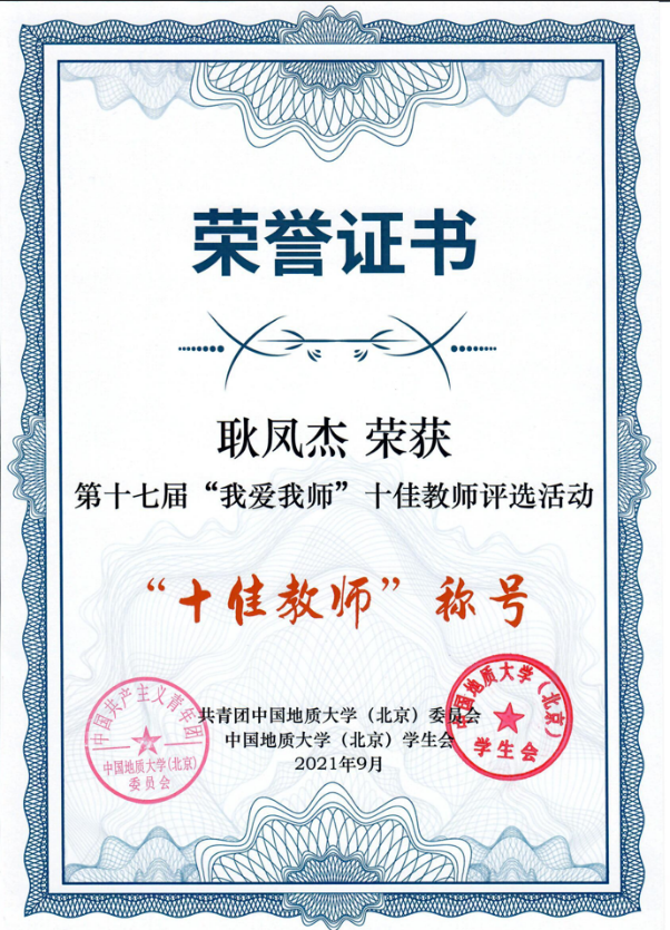 耿凤杰 杨越峰 | 2021 | 中国地质大学(北京)第十七届“我爱我师”十佳教师 |