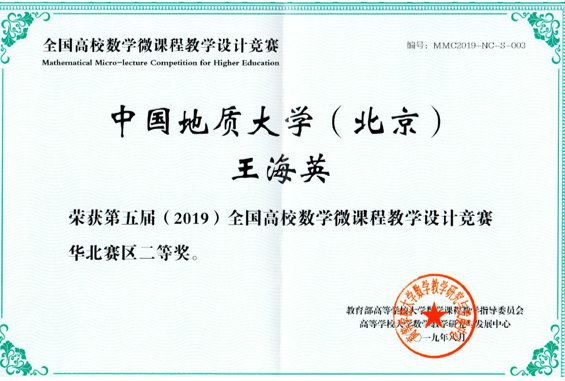 王海英 | 2019 | 第五届(2019)全国高校数学微课程教学设计竞赛华北赛区二等奖 |