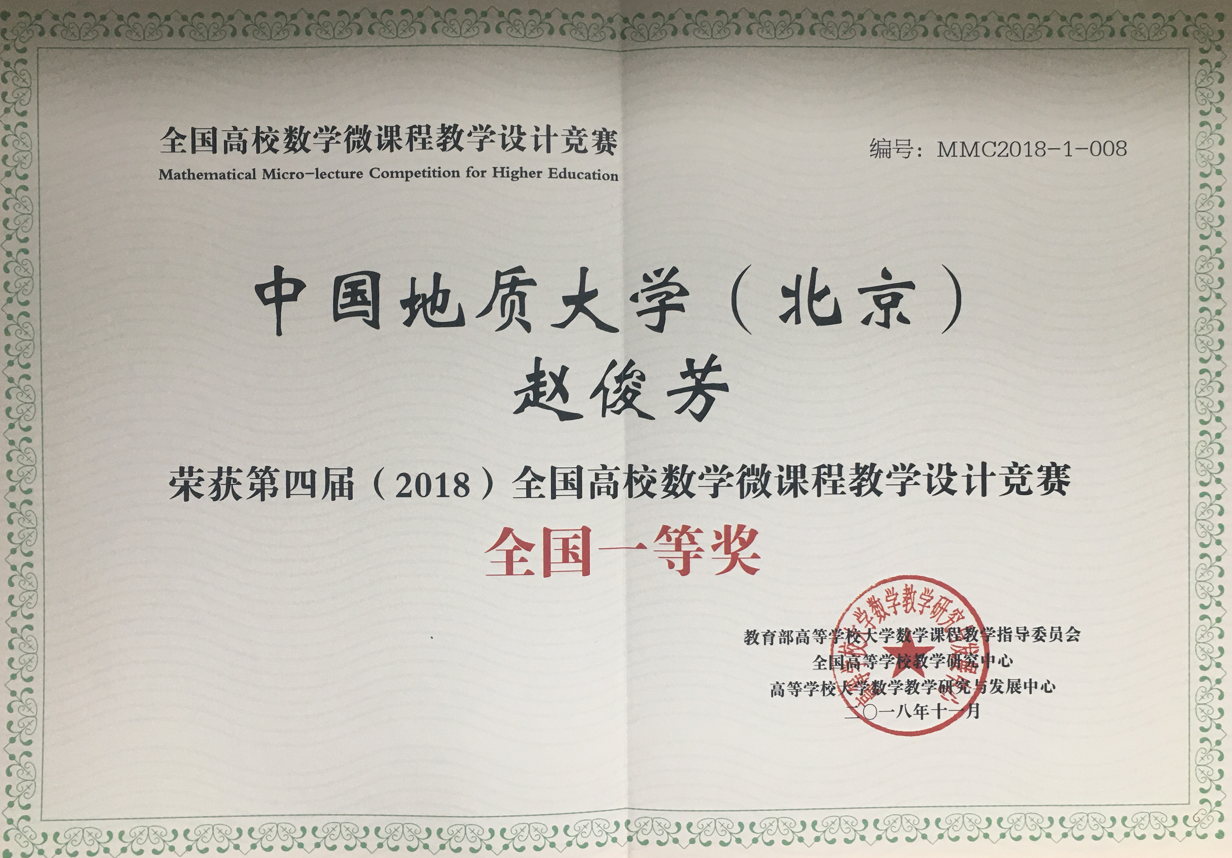 赵俊芳 | 2018 | 第四届(2018)全国高校数学微课程教学设计竞赛一等奖 |