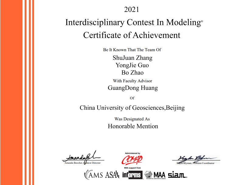 张姝娟 | 1011192111 | 美国大学生数学建模竞赛 | 2021 | H奖 |