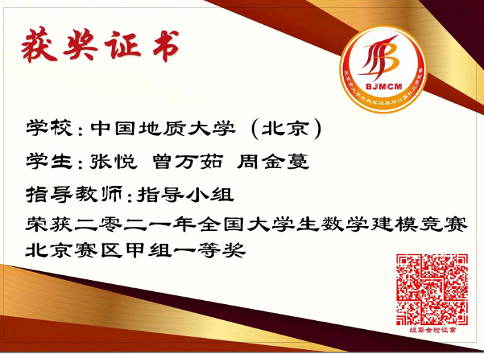 周金蔓 | 1002192103 | 全国大学生数学建模竞赛 | 2021 | 北京市一等奖 |