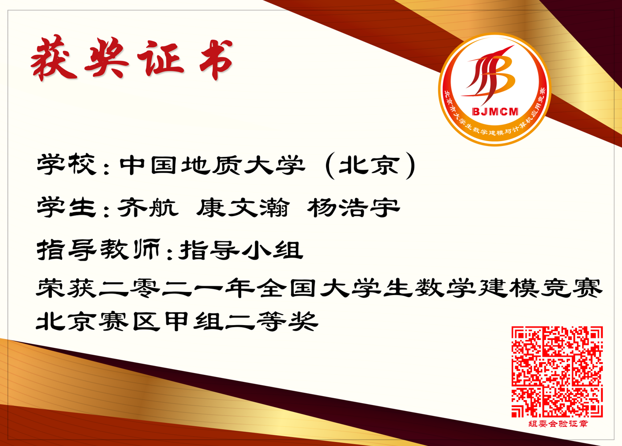 康文瀚 | 1012191215 | 全国大学生数学建模竞赛 | 2021 | 北京市二等奖 |