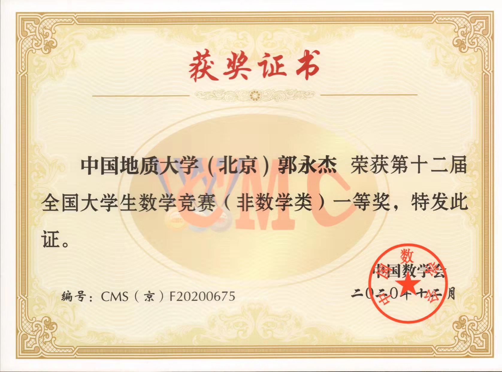 郭永杰 | 1011192130 | 全国大学生数学竞赛 | 2020 | 国1北1 |