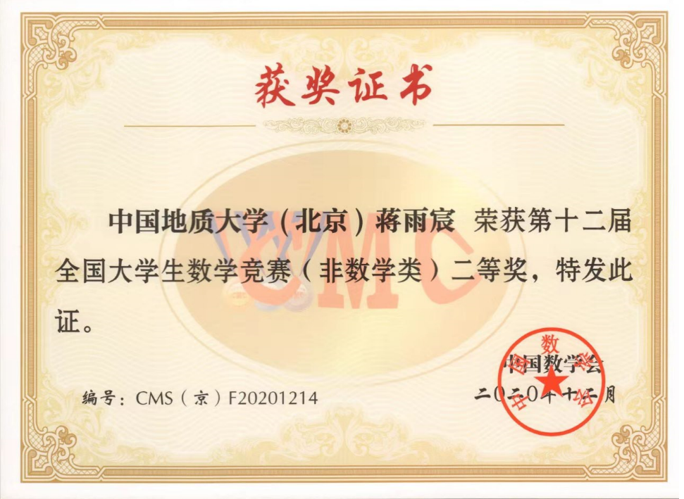 蒋雨宸 | 1006182206 | 全国大学生数学竞赛 | 2020 | 国2北1 |