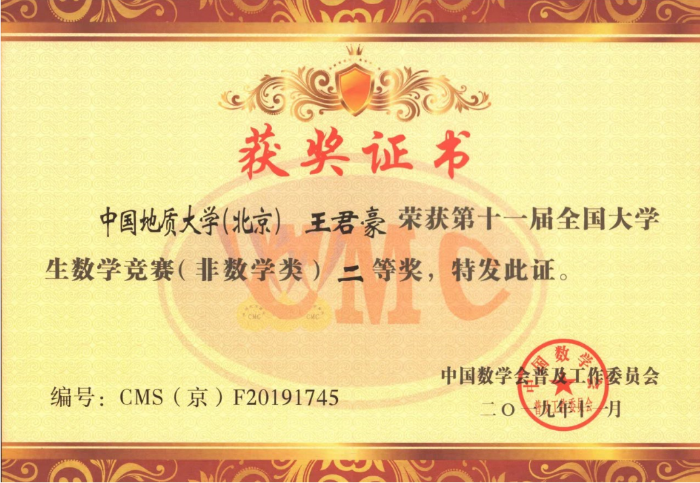 王君豪 | 1002182216 | 全国大学生数学竞赛 | 2019 | 国2北2 |