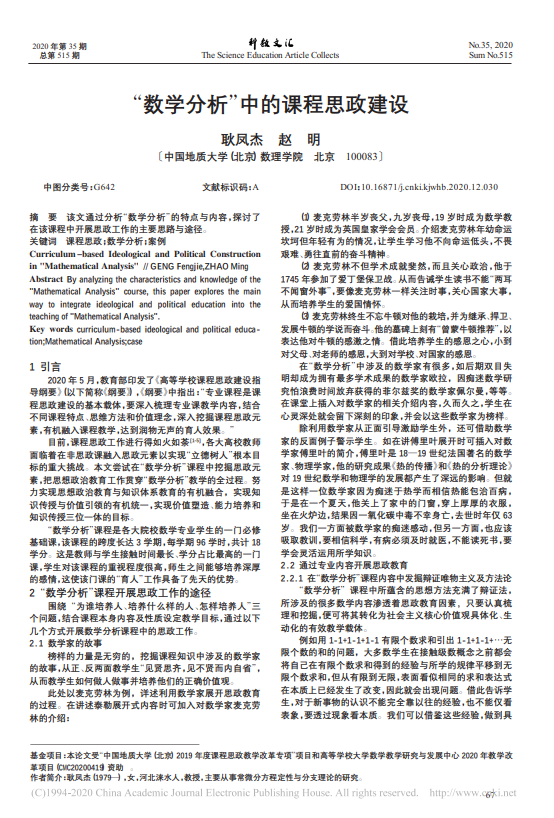 【1】耿凤杰,赵明, “数学分析”中的课程思政建设,科教文汇,2020(35):67-68