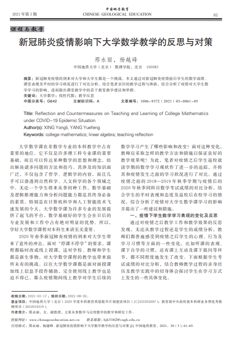 【2】邢永丽,杨越峰,新冠肺炎疫情影响下大学数学教学的反思与对策,中国地质教育,2021(3):61-65