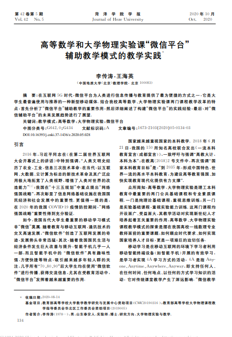 【3】李传涛,王海英, 高等数学和大学物理实验课“微信平台” 辅助教学模式的教学实践,菏泽学院学报,2020(42):134-136