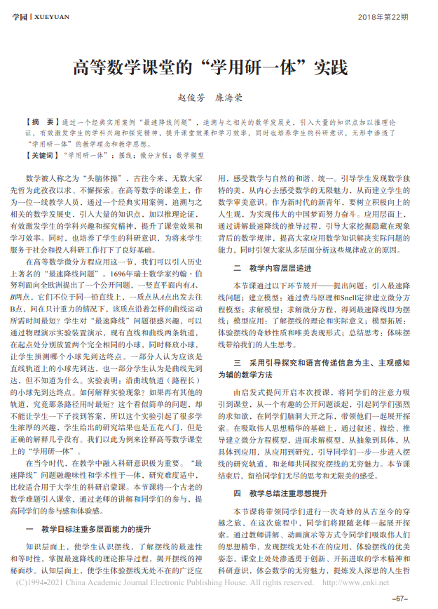 【5】赵俊芳,廉海荣,高等数学课堂的“学用研一体”实践,学园,2018(11):67-68