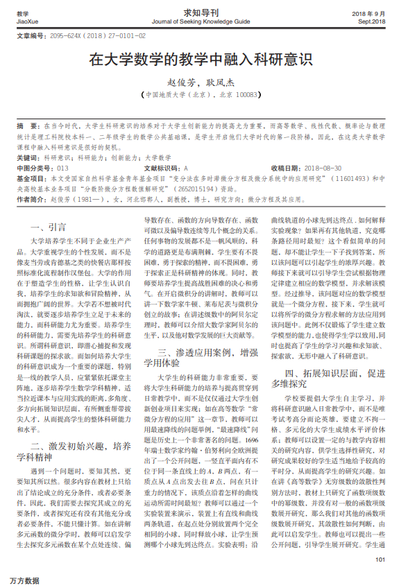 【6】赵俊芳,耿凤杰,在大学数学的教学中融入科研意识,求知导刊,2018:27-0101-02