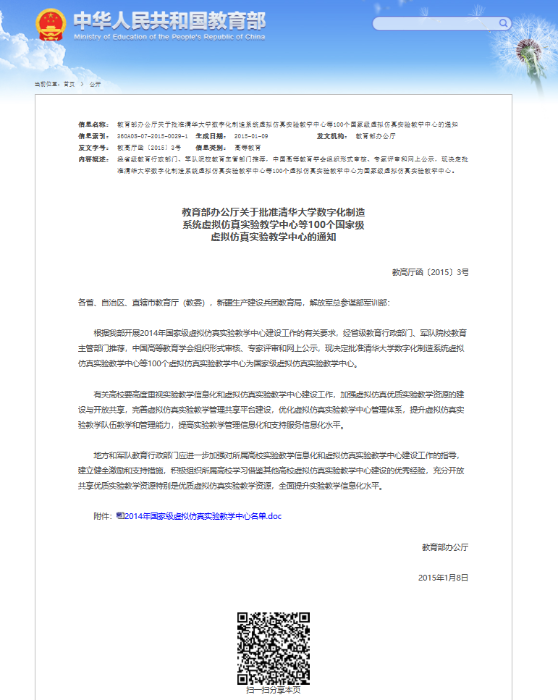 根据我部开展2014年国家级虚拟仿真实验教学中心建设工作的有关要求,经省级教育行政部门、军队院校教育主管部门推荐,中国高等教育学会组织形式审核、专家评审和网上公示,现决定批准清华大学数字化制造系统虚拟仿真实验教学中心等100个虚拟仿真实验教学中心为国家级虚拟仿真实验教学中心。