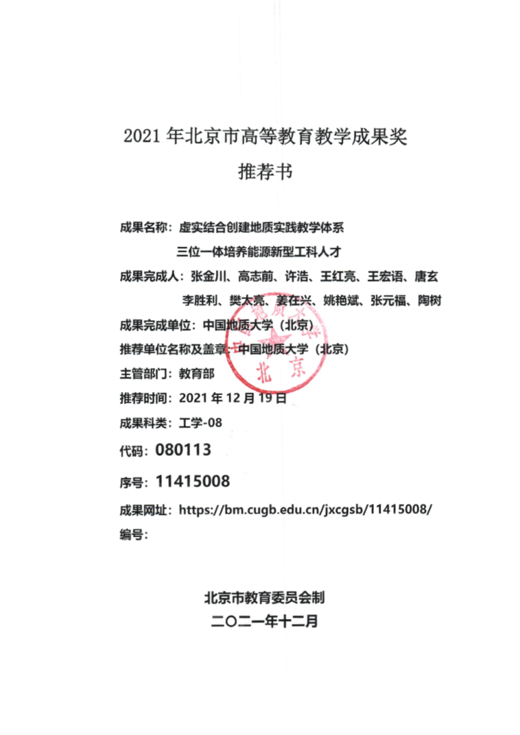 2021 | 教育教学奖:虚实结合创建地质实践教学体系,三位一体培养能源新型工科人才 | 校级特等奖 | 中国地质大学(北京) | |