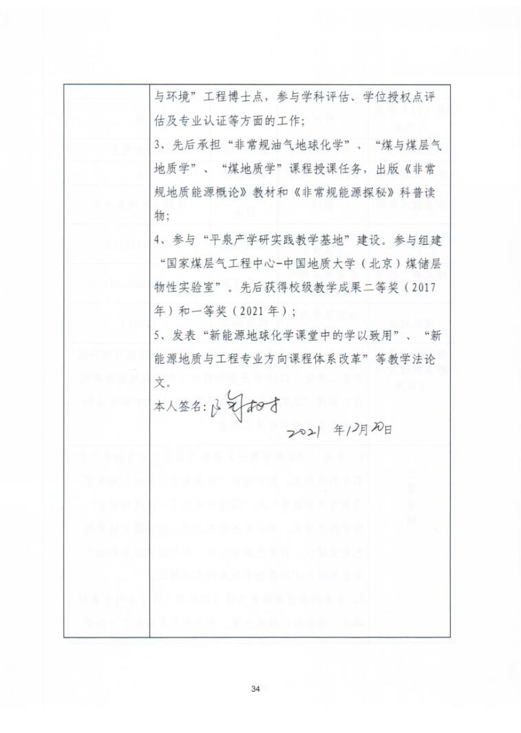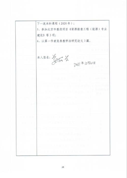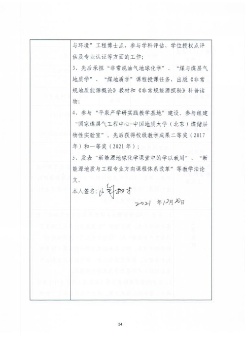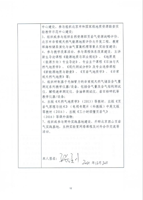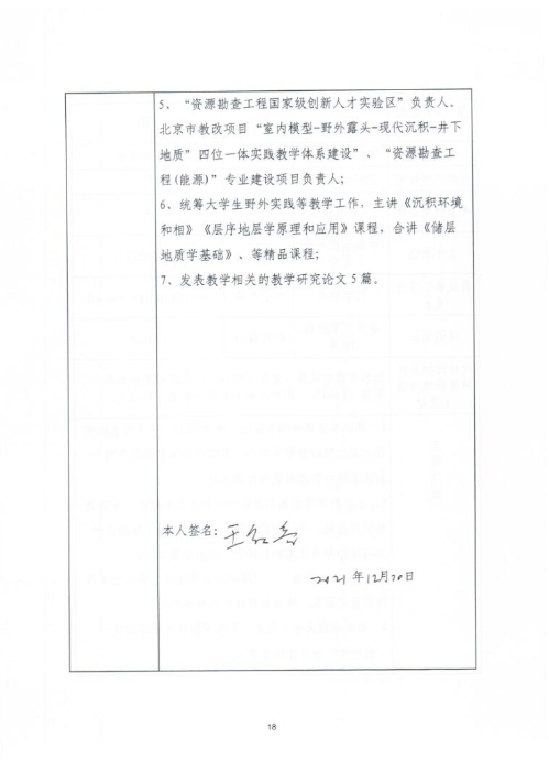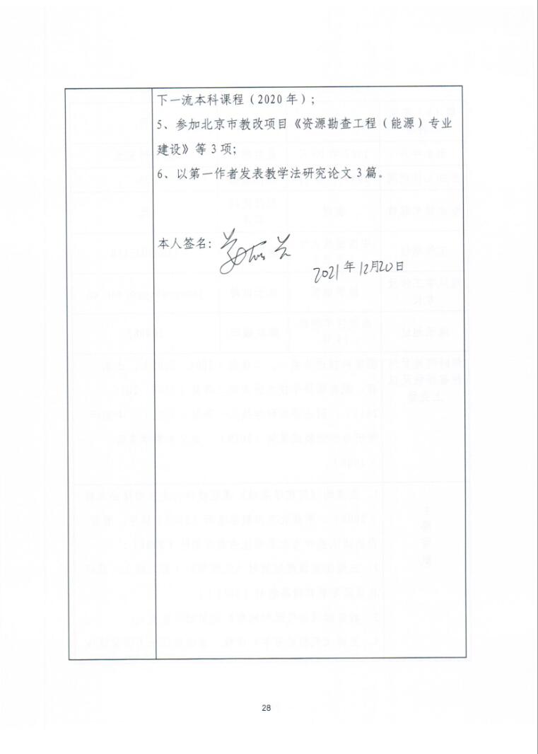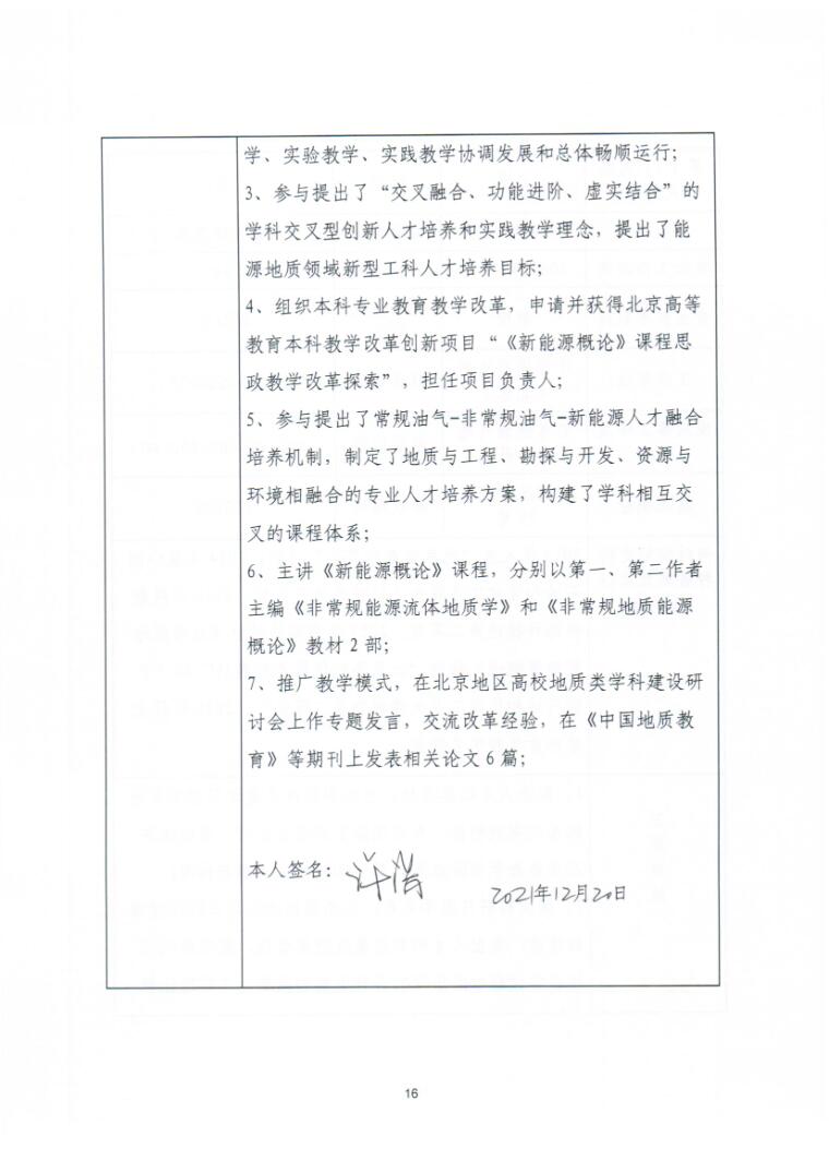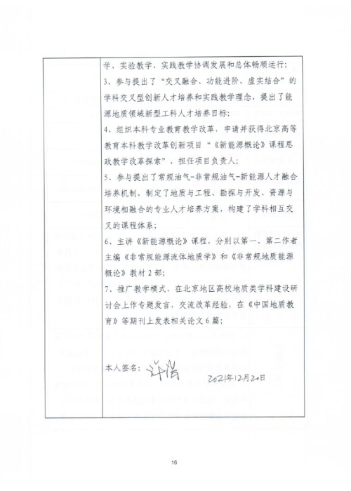 | 1、参与“《新能源概论》课程思政教学改革探索”北京市教改项目,负责完成“能源类专业周口店地质实习教学内容改革”和“煤地质学线下一流课程建设”校级教改项目。参与资源勘查工程(新能源)国家特色专业建设、教学改革等工作,参与组织非常规油气专业创新人才培养教学改革的各项措施; | ||