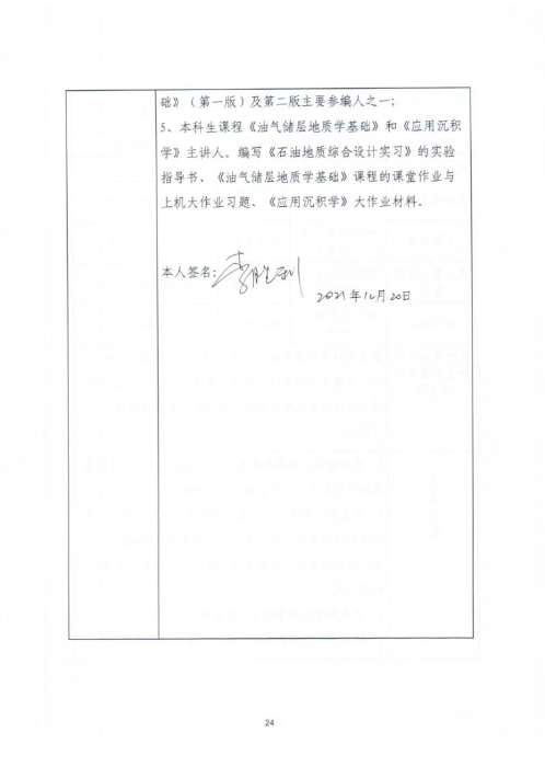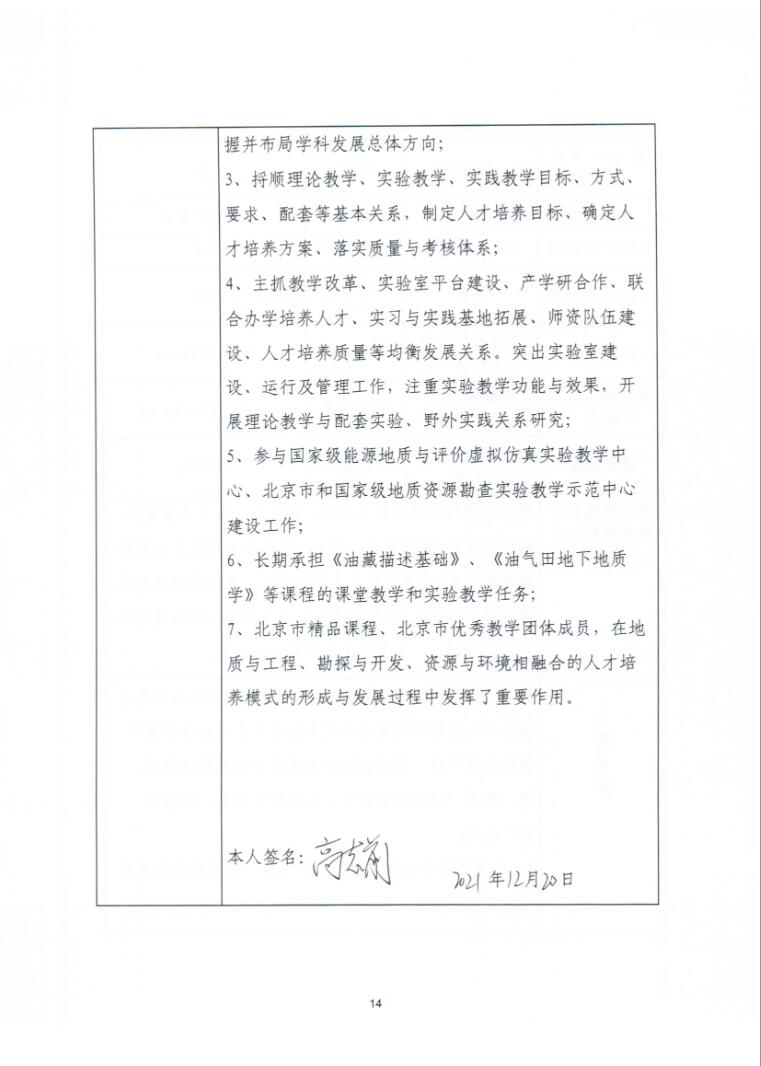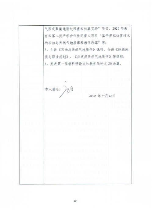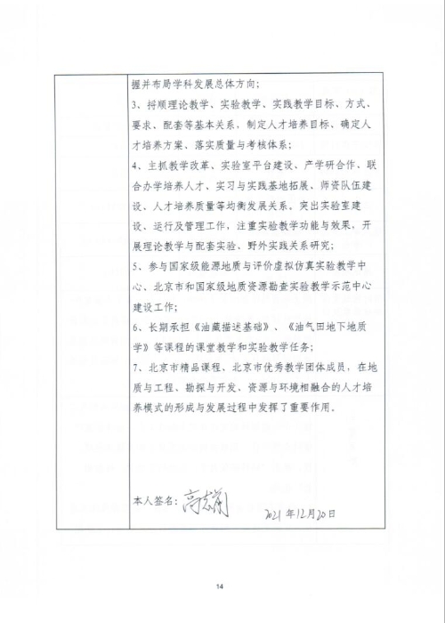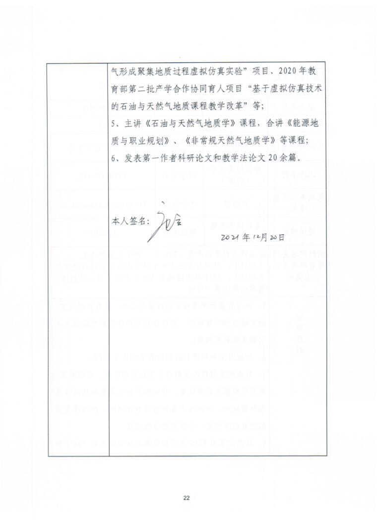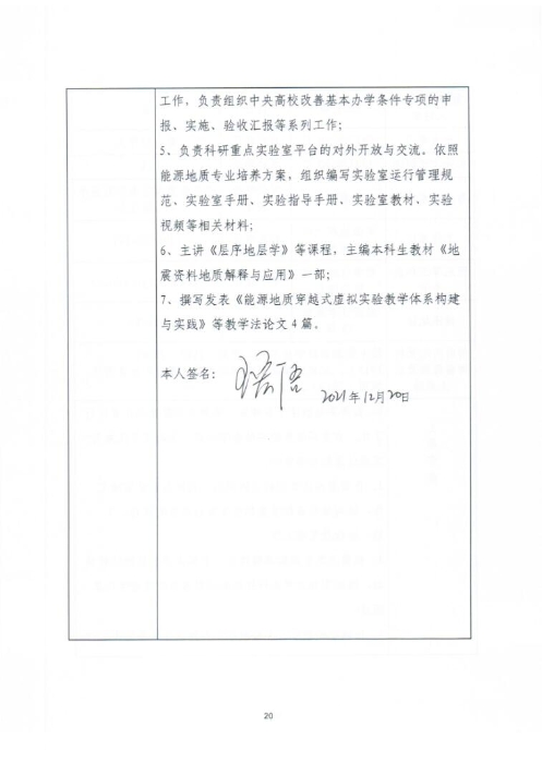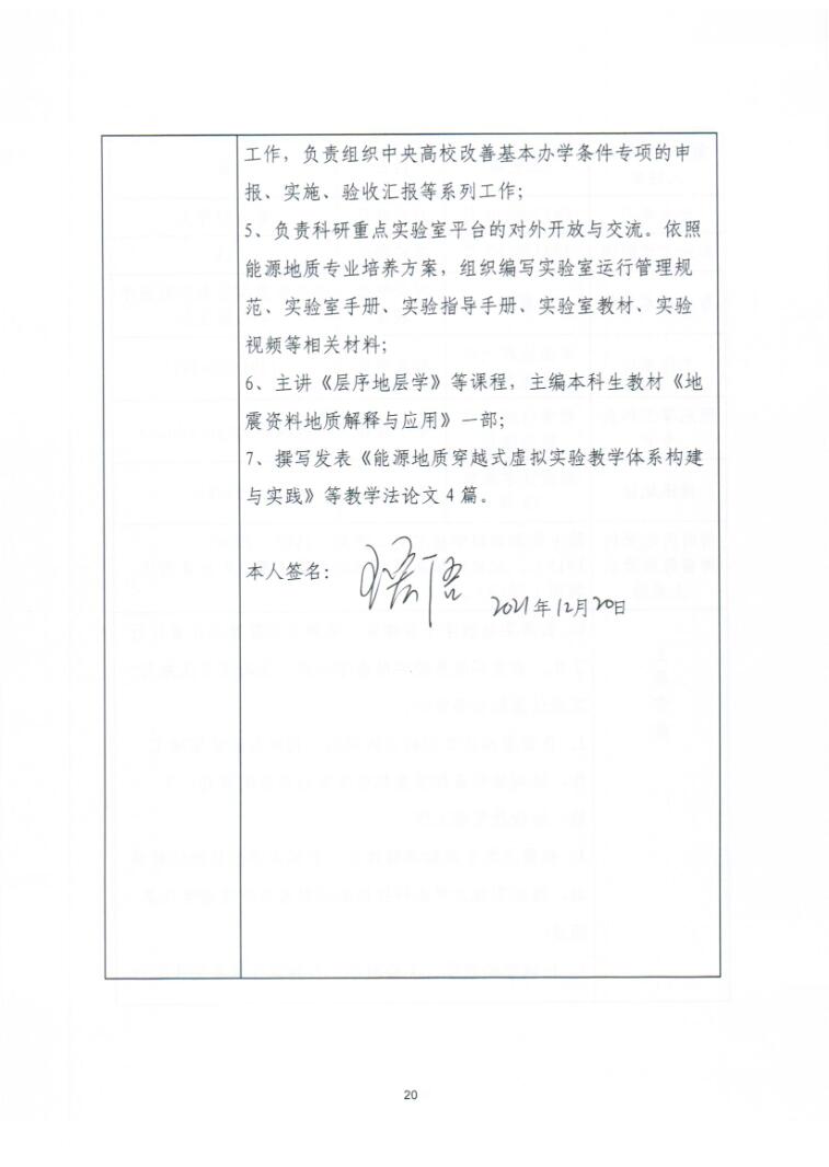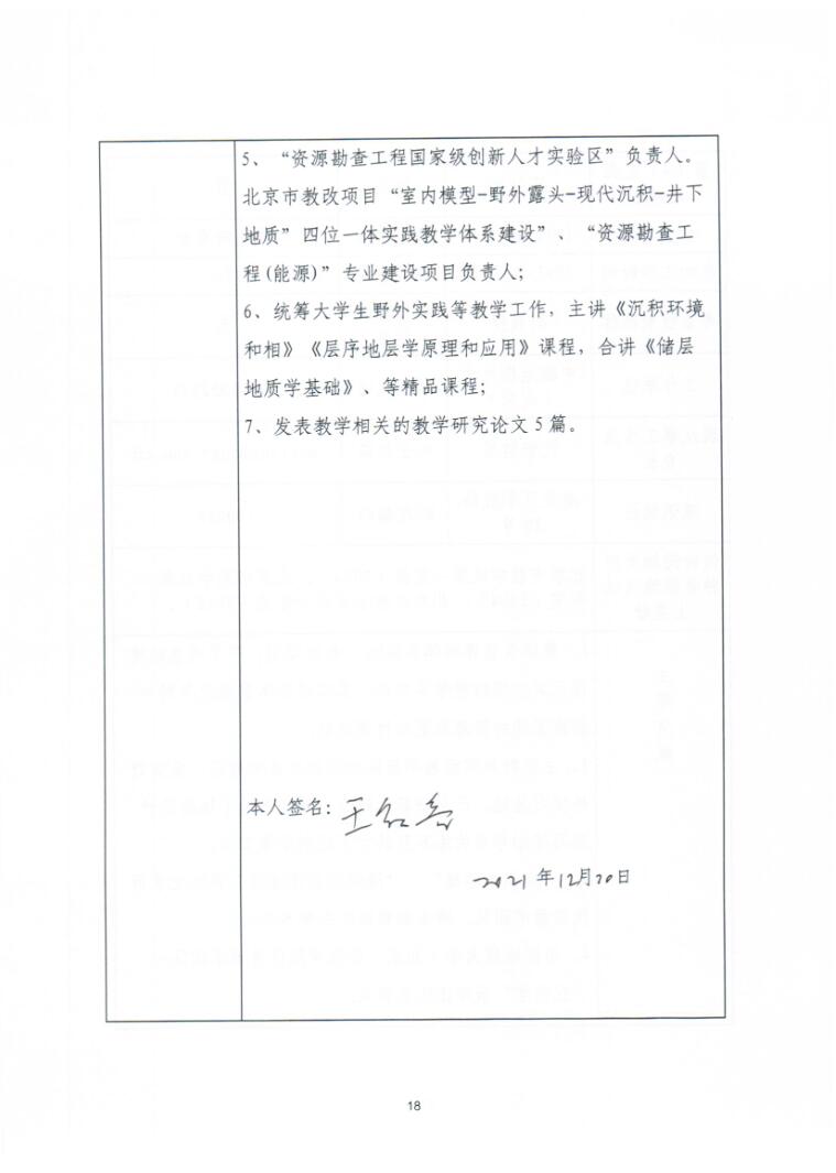 | 1、参与“《新能源概论》课程思政教学改革探索”北京市教改项目,负责完成“能源类专业周口店地质实习教学内容改革”和“煤地质学线下一流课程建设”校级教改项目。参与资源勘查工程(新能源)国家特色专业建设、教学改革等工作,参与组织非常规油气专业创新人才培养教学改革的各项措施; | ||