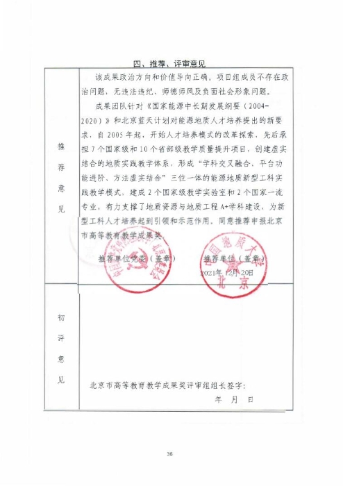 4.成果推广应用效果(不超过1000字) (1)提高了能源地质工科人才培养质量,为国家地质能源工程输送了大量优秀人才,服务了国家重大能源战略。 学生参与大学生科技创新358项,近三年已实现全员参与;近五年,学生授权发明专利60余项,年均发表论文80余篇;参与学科/专业竞赛100余项,获省部级以上奖励217项;学生就业率持续保持在95%以上。 向能源行业输送毕业生4000余名,为山西延长石油集团量身打造页岩气订单班,在中国最大页岩气田(焦石坝)勘探开发、南海天然气水合物成功试采、地热规模化应用、煤层气商业化开发、“西气东输”等国家重大能源工程中,涌现出以全国五一劳动奖章获得者徐长贵、李四光奖获得者云露、国家杰出青年基金获得者姚艳斌等为代表的大批优秀人才。 教师积极开展实践教学研究,承担各类教改项目220项,入选北京市精品/优质课程5项,市级优质本科教材4本,国家级规划教材4本,国家一流课程1门,发表教改论文350篇。产生北京市教学/青年名师6人,省部级团队3个。资源勘查工程和石油工程2个专业,在成果建设期全部获批国家教学质量建设工程项目,地质资源与地质工程获批国家A+学科;在成果应用期全部获批国家一流本科专业建设。 实践教学平台吸引2.5亿元软件支持,建成国家级实验教学示范中心、虚拟仿真实验教学中心、工程实践教育中心等,3000余人前来学习交流。相关成果在“北京高科联盟”举办的“京津冀高等工程教育研讨会”等10个行业会议上受邀介绍经验并引起广泛关注。建设成果在中国矿业大学、长江大学、吉林大学、香港中文大学(深圳)等20多所高校获得了推广和应用。 CCTV发现之旅对滦平实践教学基地进行了“记录东方滦平:创造油气勘探新奇迹”报道;新华财经对“创新探索非常规油气人才培养”等实践教学进行了报道;自然资源报等对基础教学团队进行了专版报道。国家“十三五”重点出版物出版电视专题片《页岩气原理与技术》,国家电网公司出版《三小时读懂页岩气》,团队出版《非常规能源探秘》等引起社会强烈反响。 | ||||