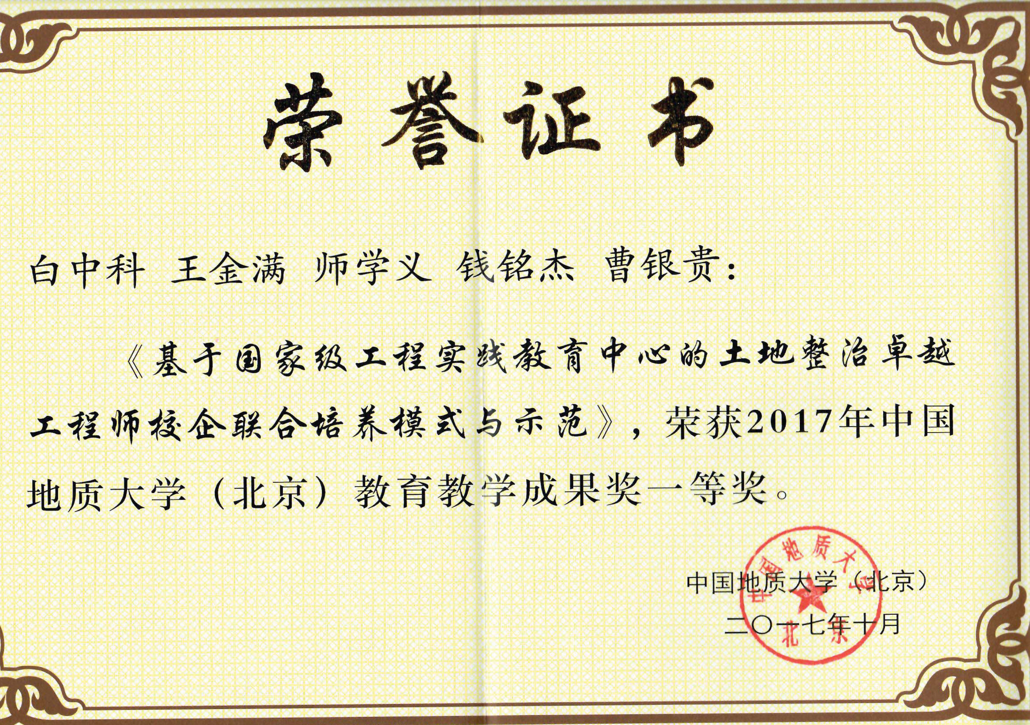 2. 中国地质大学(北京)2017年教育教学成果一等奖:基于国家级工程实践教育中心的土地整治卓越工程师校企联合培养模式与示范;