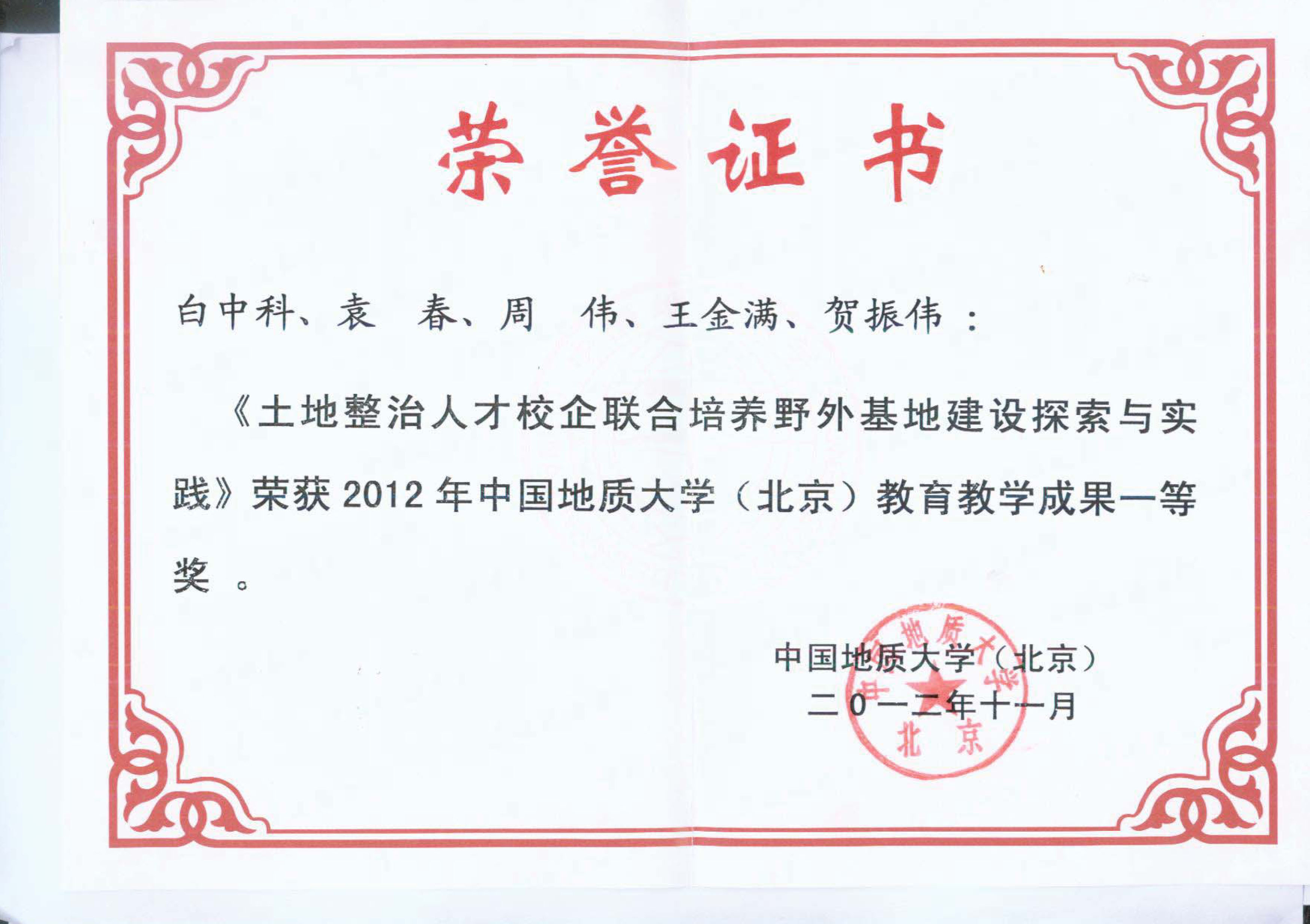 3. 中国地质大学(北京)2012年教育教学成果一等奖:土地整治人才校企联合培养野外基地建设探索与实践。