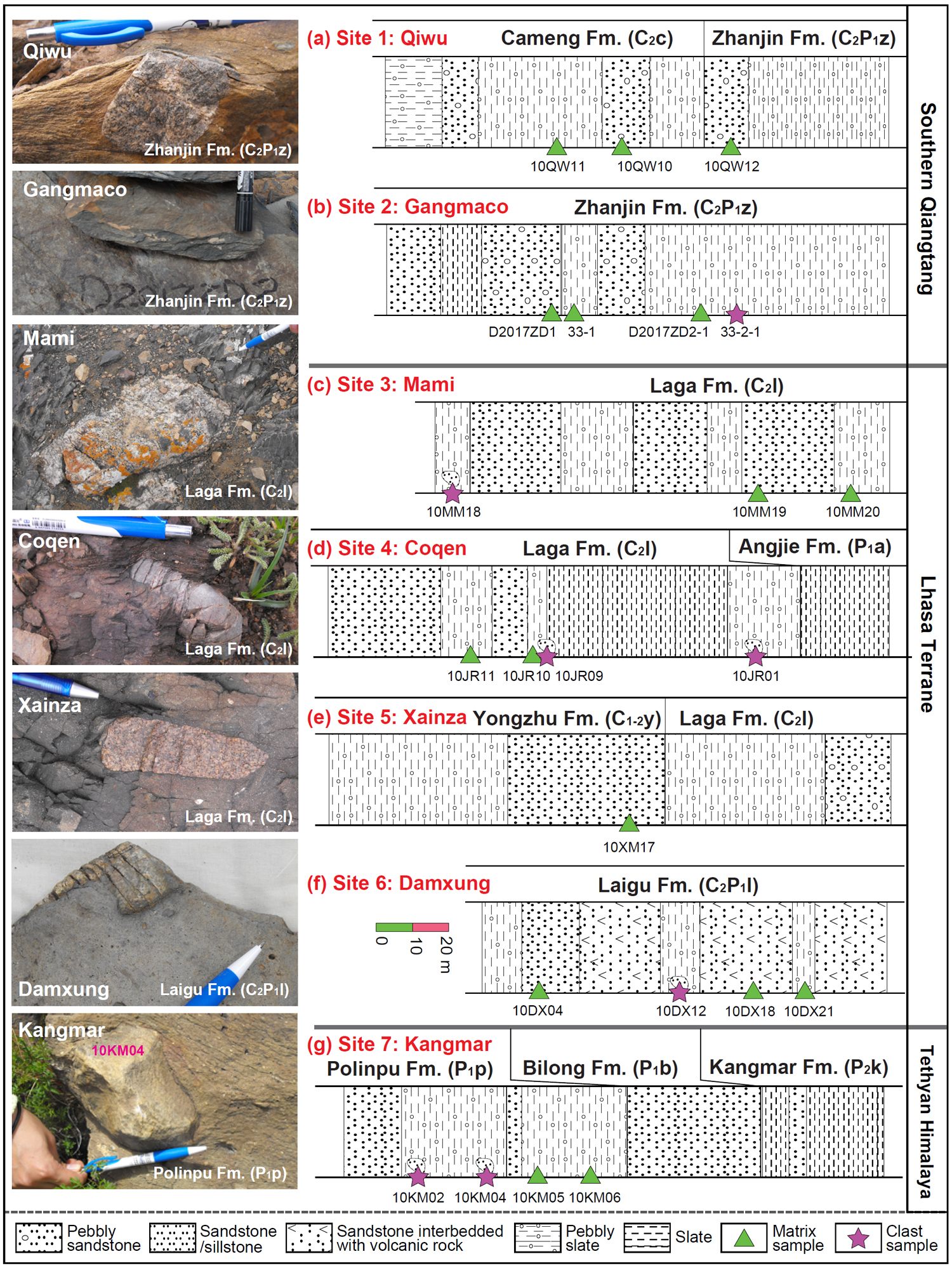 针对上述研究难题,中国地质大学(北京)“大陆汇聚与青藏高原生长”求真研究群体王青副教授与合作者一起,对青藏高原南羌塘地体、拉萨地体和特提斯喜马拉雅的7个石炭-二叠纪冰海相杂砾岩剖面开展了野外调研(图1和图2),并在岩相学观察基础上,对不同类型的砾石和基质进行了大量的碎屑锆石U-Pb年龄和Hf同位素测试,并结合区域岩浆和变质记录研究结果,取得以下新进展和新认识: