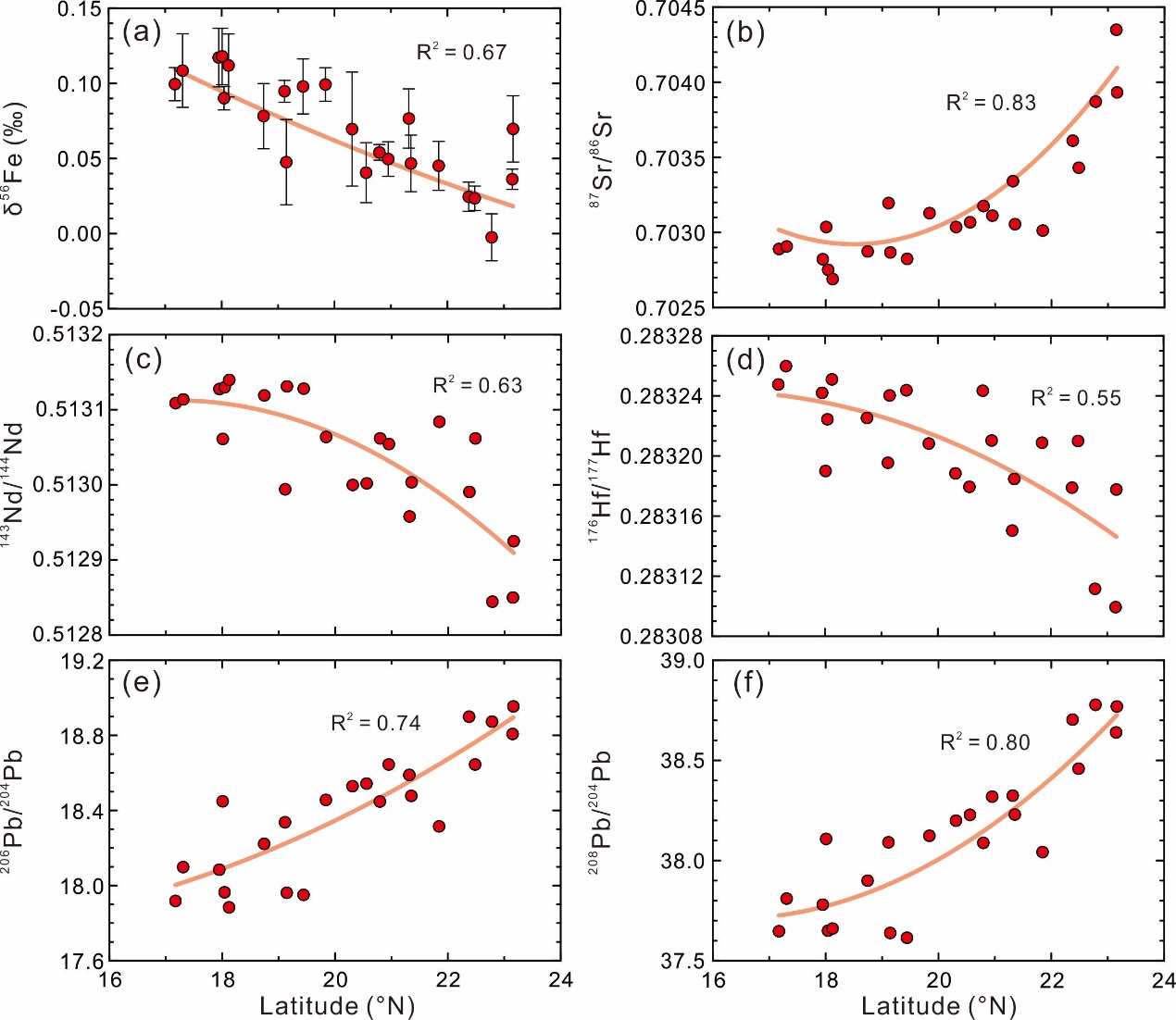 图2 北马里亚纳海槽玄武岩Sr-Nd-Pb-Hf-Fe同位素随纬度变化