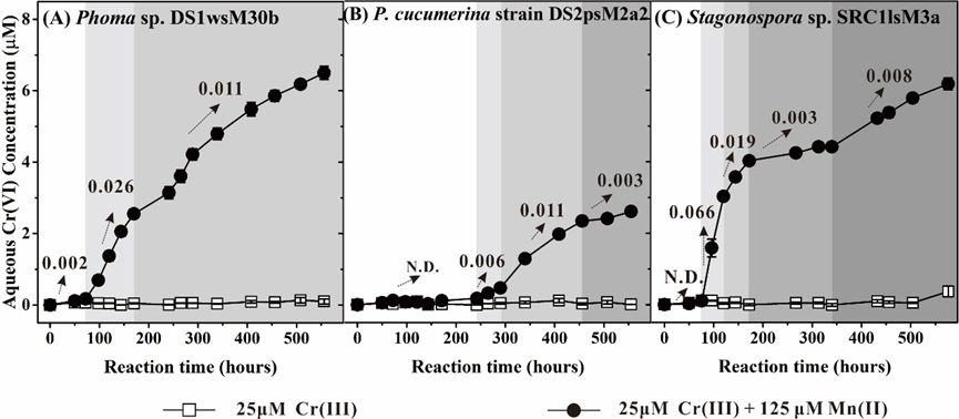 针对上述科学问题,我校水资源与环境学院刘晓磊博士后在董海良教授指导下,考虑到子囊真菌具有不同类型的锰氧化机制,选取了三种不同的子囊真菌,探究锰氧化真菌耦合Mn(II)与Cr(III)氧化反应的动力学过程及机理。通过系统的研究分析,取得如下创新性成果: