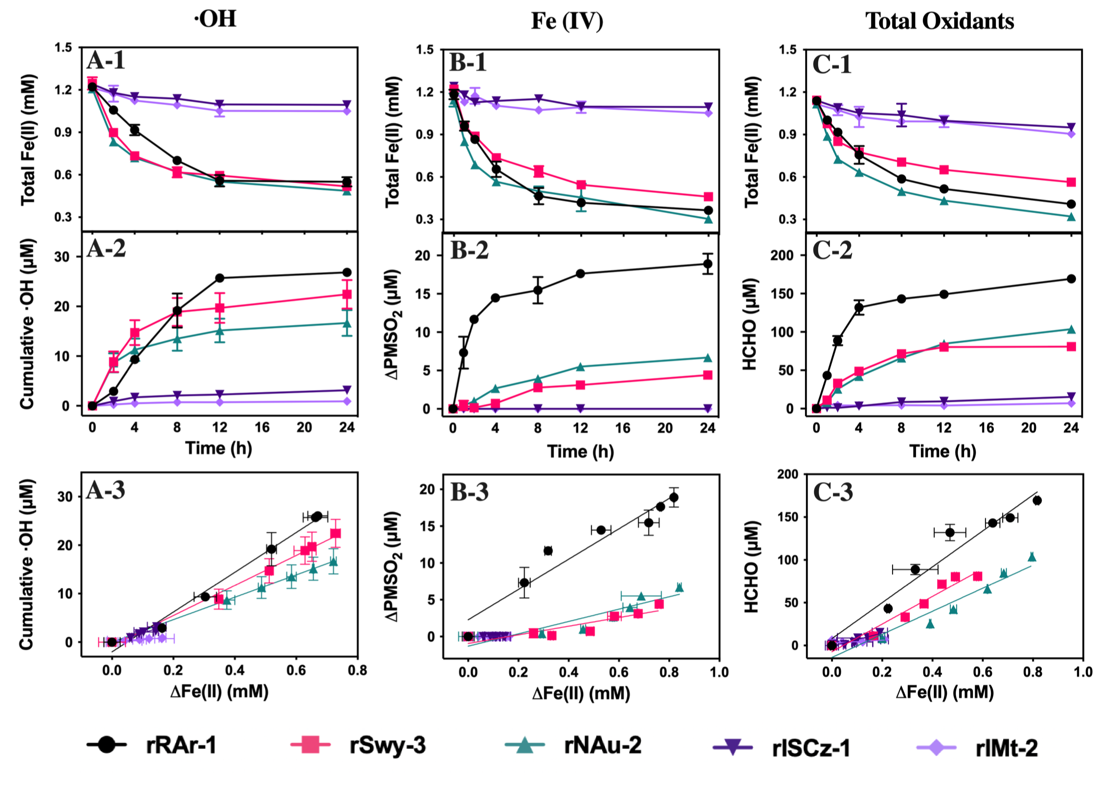 (1)在有氧条件下,还原态蒙脱石—伊利石粘土矿物可以产生强氧化性物质?OH与弱氧化性物质Fe(IV)(图1)。其中伴随累托石、蒙脱石与绿脱石Fe(II)氧化产生的?OH处于相似水平,但累托石体系中Fe(IV)的产量是蒙脱石与绿脱石体系中的3-4倍。