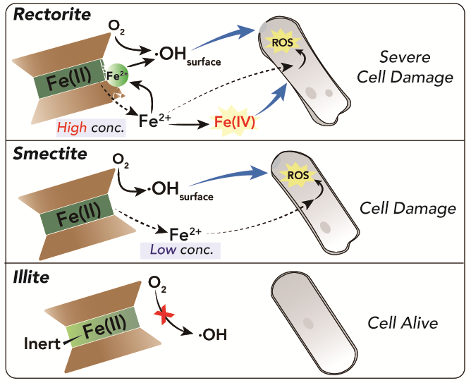 传统抗生素的滥用导致细菌的耐药性不断增强与全球流行,引发医学界对于现存抗生素有效性的担忧,开发新型杀菌药物迫在眉睫。粘土矿物因其独特的物理化学性质与表面反应活性而受到关注。粘土矿物具有广谱的杀菌能力,其杀菌能力与粘土矿物溶出的金属离子以及产生的活性氧基团相关。天然粘土混合物中的蒙脱石—伊利石等含铁矿物组分是使得混合物具有杀菌作用的主要成分。课题组前期的研究成果指出了富铁粘土矿物绿脱石与壳聚糖插层的绿脱石能够在近中性条件下发生氧化产生?OH,从而杀死细菌。但除了还原态绿脱石以外,蒙脱石—伊利石单矿物的杀菌能力与机理尚未得到系统的研究。同时,蒙脱石—伊利石系列粘土矿物虽均有2:1型层状结构,但铁含量、层膨胀性和比表面积差异较大。相对于蒙脱石和伊利石端元矿物,该矿物族还普遍存在蒙脱石—伊利石单元层互相叠置所形成的混层矿物。而这些粘土矿物的杀菌能力与机理,以及杀菌效率和层膨胀性之间的关系还尚未被研究。