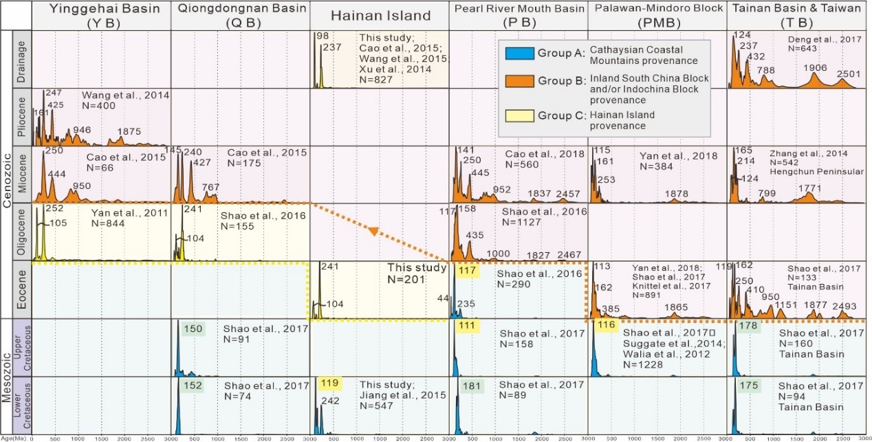 针对以上科学问题,我校地球科学与资源学院陈艳博士,在国家自然科学基金基础科学中心项目(41888101)的资助下,对海南岛白垩纪鹿母湾组、始新世瓦窑组和宁远河现代水系沉积物开展了沉积学和碎屑锆石研究,取得了如下创新性认识: