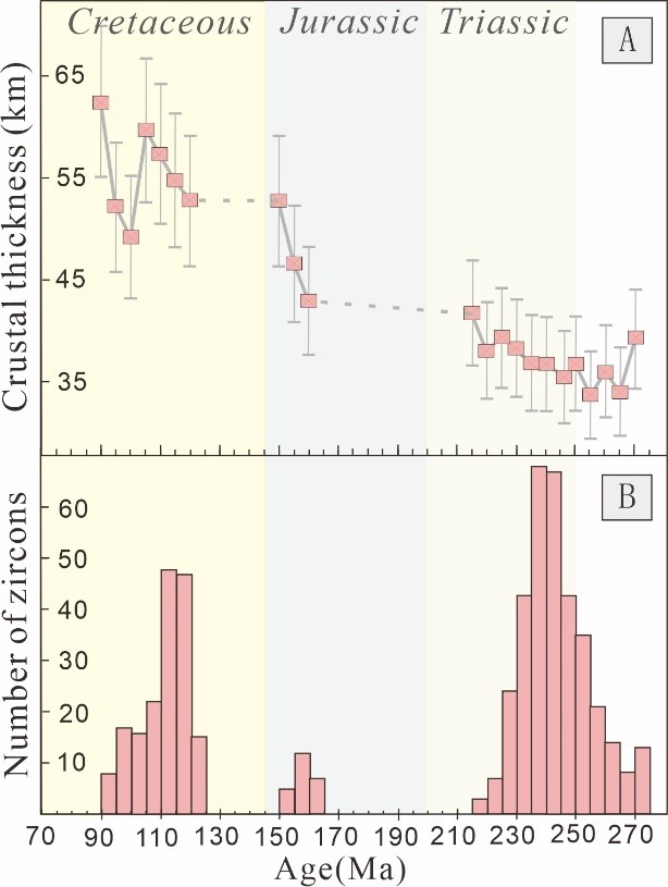 图2. (a) 海南岛碎屑锆石 Eu/Eu*元素指标重建的华南边缘地壳厚度演化(n=508), (b) 本研究中使用的碎屑锆石年龄数量分布