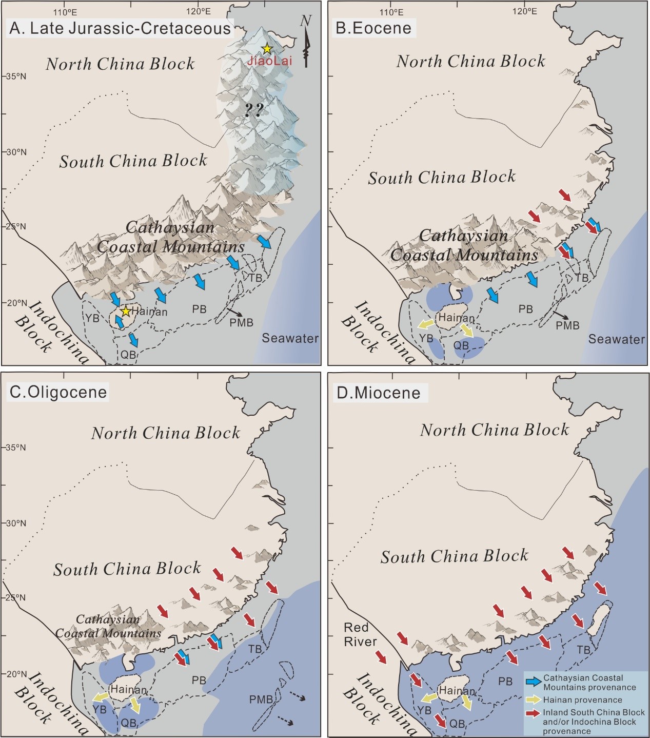 图3. 晚侏罗世-白垩纪以来华夏海岸山脉的演化及南海北部边缘盆地物源演化示意图