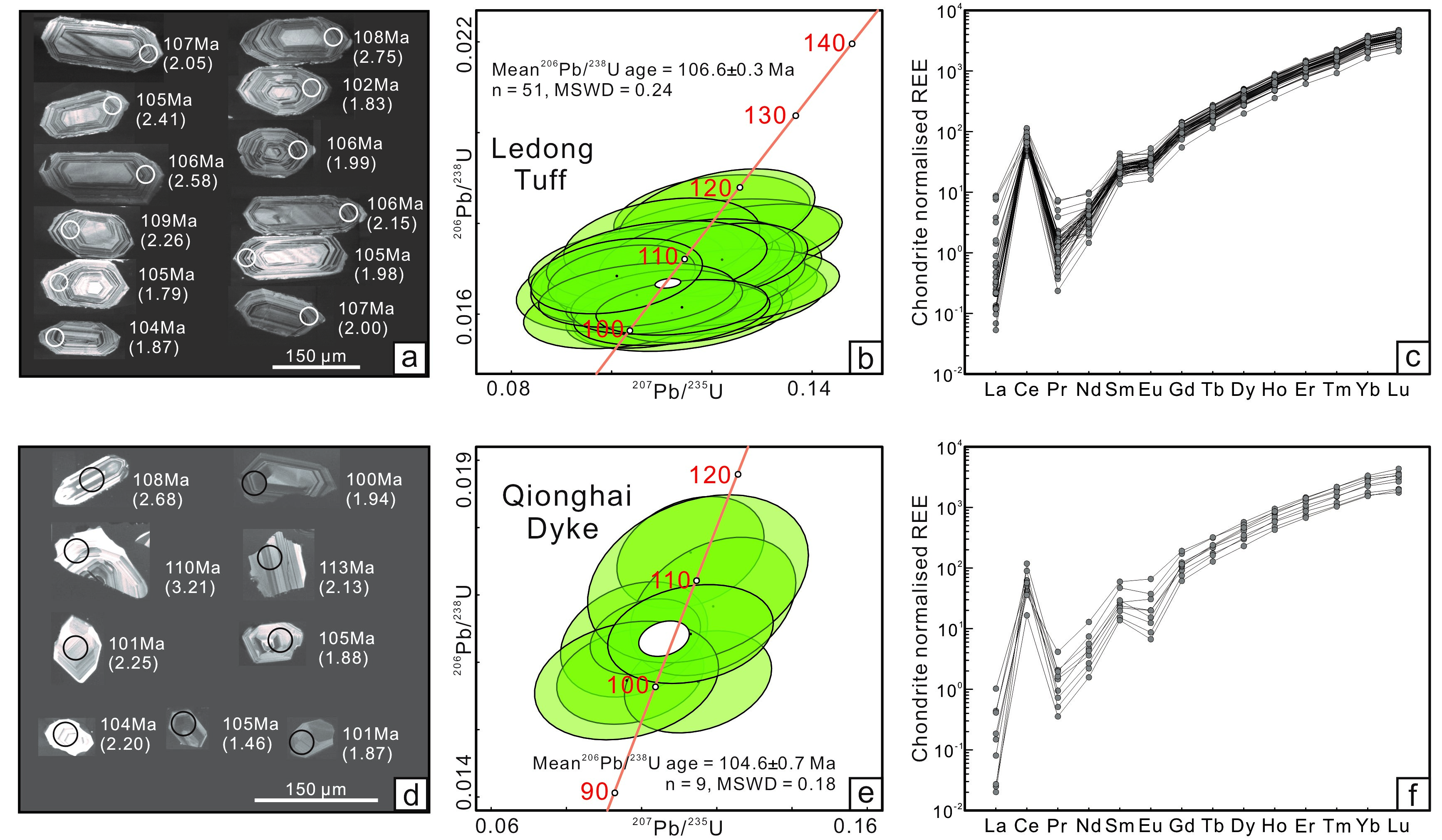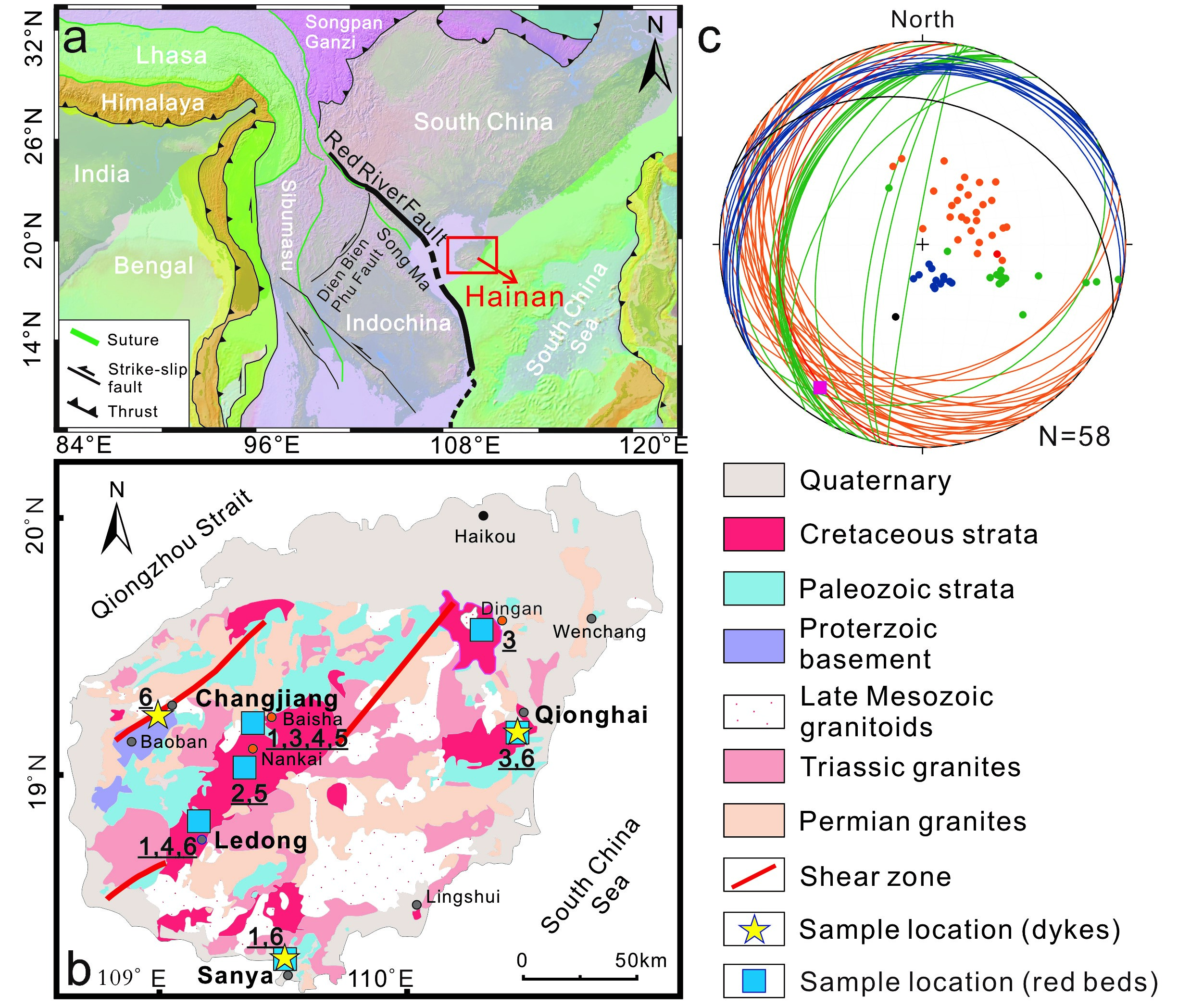 沉积岩(红层)中高度稳定的赤铁矿剩磁被广泛应用于古地磁研究中,是构造古地理重建的基石。然而,剩磁的获得时间(原生=沉积剩磁vs次生=化学剩磁)一直存在着巨大争议,被写进教科书,称之为“红层之争”(Red bed controversy)。那么,准确厘定赤铁矿剩磁的获得时间成为关键科学问题。海南岛位于华南最南缘,一方面,海南岛白垩纪红层记录了原生剩磁还是次生剩磁长期争议不下,限制了对红河断裂构造位移以及对印支地体侧向挤出运动学的认识;另一方面,海南岛白垩纪地层中发育凝灰岩,且被辉绿岩墙侵入,为准确厘定赤铁矿剩磁获得时间,解决华南构造古地理争论提供了可能。