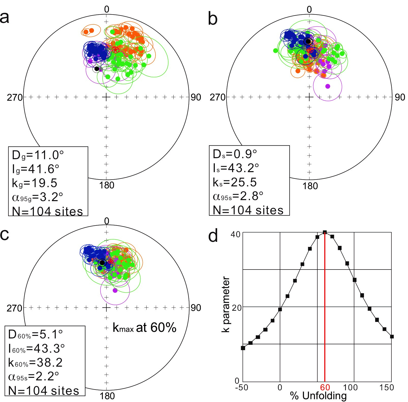 图4 海南岛白垩纪鹿母湾组红层104个采点古地磁结果