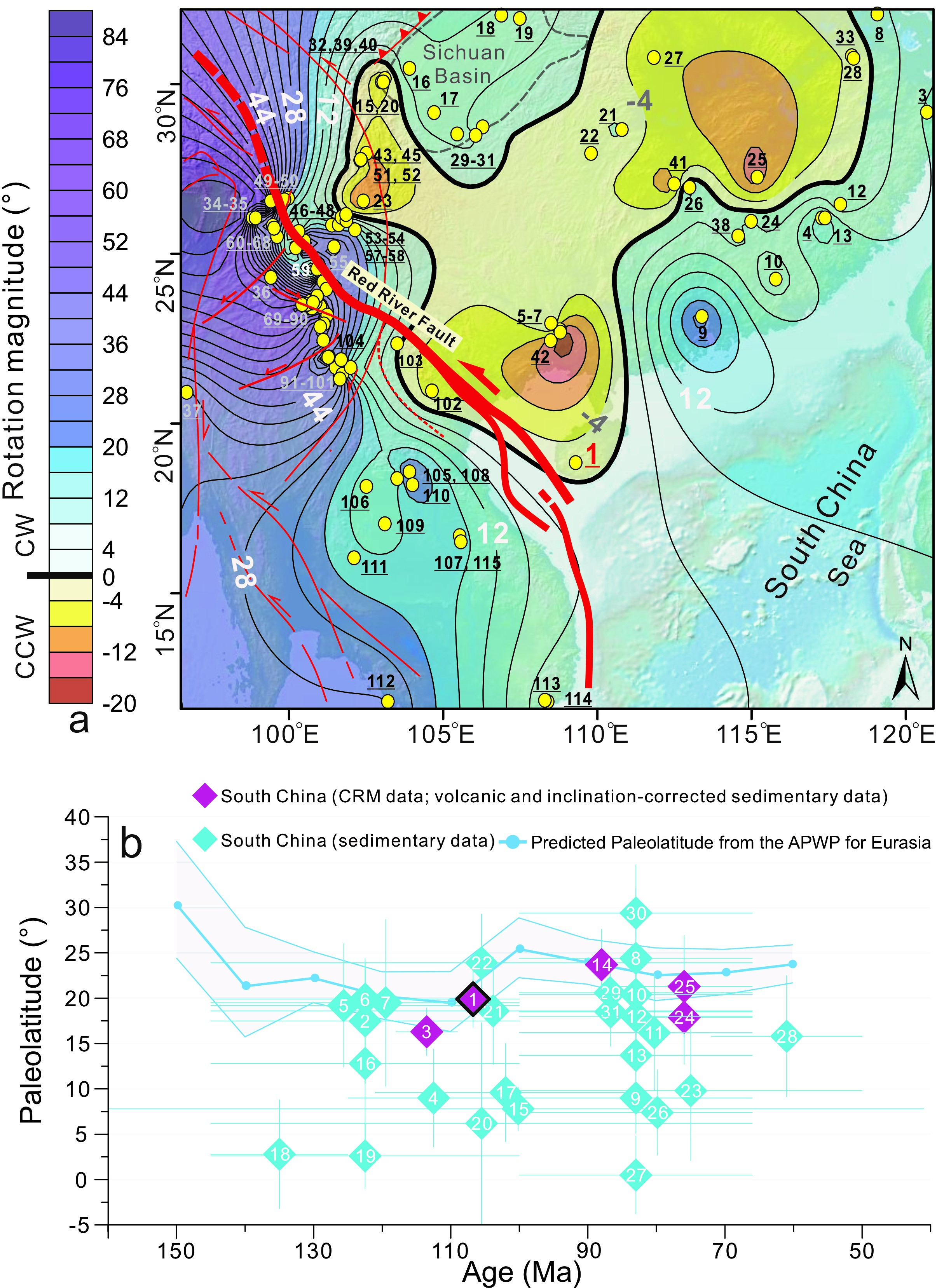(4) 东南亚古地磁偏角大数据等值线图示踪了红河断裂,揭示了红河断裂两侧相反的构造旋转,与印支地体的侧向挤出相关。