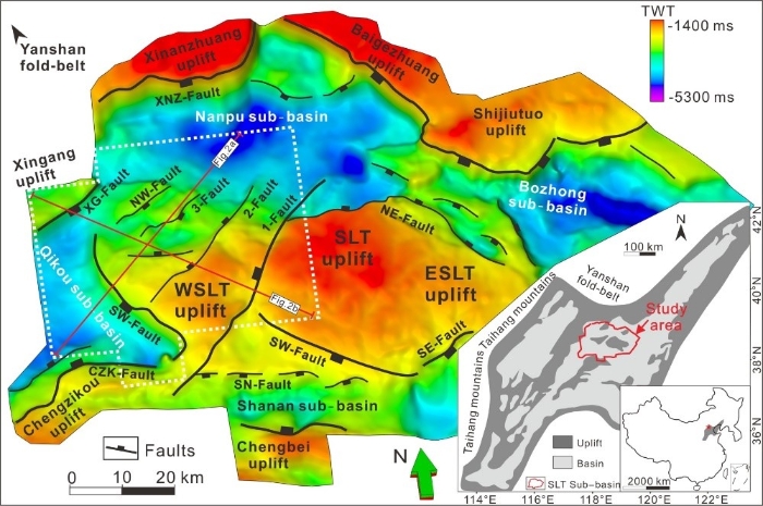针对这一科学问题,海洋学院青年教师陈贺贺与其博士生导师中国石油大学(北京)朱筱敏教授、挪威卑尔根大学Robert Gawthorpe教授及美国科罗拉多矿业学院Lesli Wood讲席教授等合作,依托“十三五”国家重大科技专项、111学科创新引智基地项目的资助,选取渤海湾盆地古近系-新近系沙垒田地区为研究对象(图1),综合岩心、测井及三维地震资料,深入研究岩浆侵入与火山喷发过程与裂谷盆地沉积充填的交互响应。取得了如下主要认识: