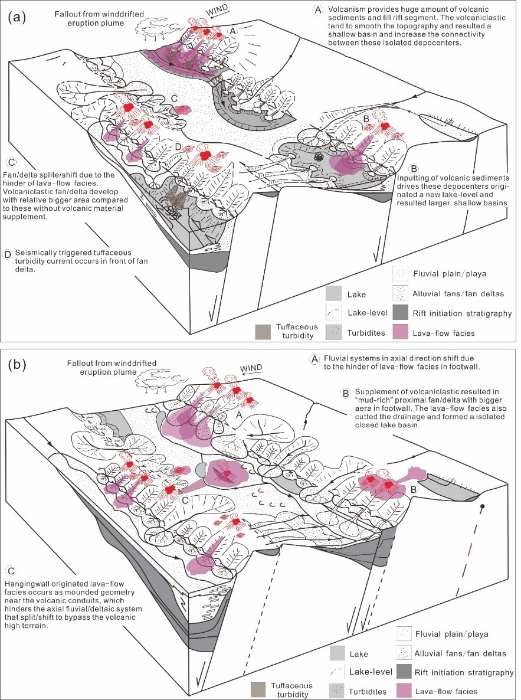 这项研究强调了裂谷盆地中火山活动和火山地貌对沉积物搬运路径、沉积体系和沉积速率的重要影响。依据本研究提出的火山型裂谷盆地构造-沉积通用模型也强调了火山作用和碎屑沉积体系的交互响应(图3),推进了裂谷盆地当前的构造-沉积研究。