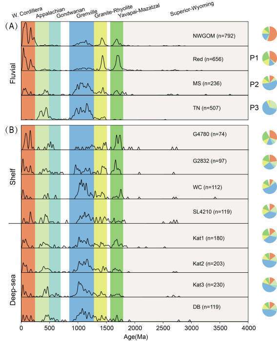 针对上述科学问题和墨西哥湾深时古地理研究中观察到的现象,我校海洋学院副教授徐杰与美国德克萨斯大学奥斯汀分校John W. Snedden、Craig S. Fulthorpe高级研究员、Daniel F. Stockli、William E. Galloway教授以及Zachary T. Sickmann助理研究员一起,依托Gulf Basin Depositional Synthesis Industrial Associates Program项目、中央高校基本业务费(35832020029)、国家自然科学基金(41902108)和111学科创新引智基地项目(B20011)的资助,综合岩石学、河流-陆架-深海样品的碎屑锆石年代学(图2)、Top-down Mixing model定量计算方法及区域的岩相古地理图件及认识,开展早-中新世沉积物从源区到深海平原的搬运过程。