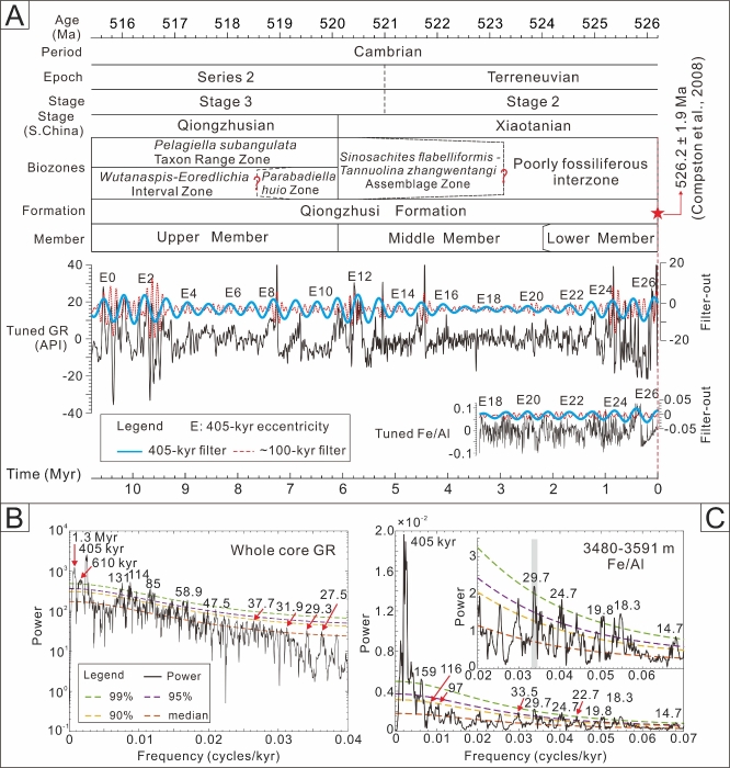 针对这一科学问题,我校能源学院樊太亮教授团队博士生张坦与其副导师李一凡副教授,北京大学李明松研究员,比利时列日大学Anne-Christine Da Silva教授等合作,依托国家自然科学基金企业创新发展联合基金项目、中央高校基础研究经费、中科院战略性先导研究项目的资助,选取四川盆地下寒武统筇竹寺组为研究对象(图1),综合岩心、测井、地化、年代地层以及古生物地层资料,研究了早寒武世温室期间短期海平面升降的驱动机制以及重建了深时太阳系的混沌运动与地月系统的演化历史。取得了如下主要认识: