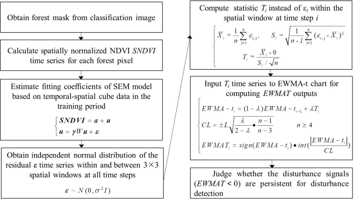 1、利用空间上下文信息将时间序列指数转换为空间标准化指数消除季节性变化,大大降低了拟合森林无扰动状态下变化的简化模型对稠密数据的要求。进而通过空间残差模型(Spatial Errors Model,SEM)拟合简化模型,计算得到时空域独立正态分布的残差时间序列。
