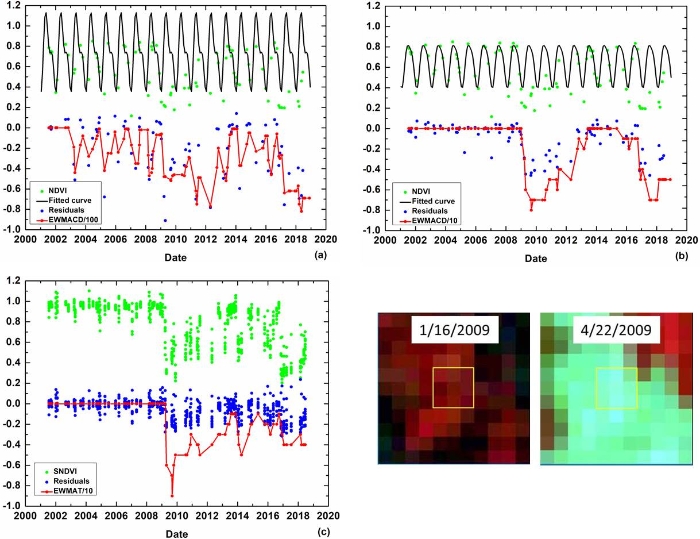 4、指数空间标准化、在时间维变化过程拟合中融入空间邻域信息(SEM模型)以及整合空间邻域残差计算空间统计量T等多层次融合空间上下文信息的策略使得EWMATCD算法对影响扰动检测的云雨等噪声的抗干扰能力进一步提升(图4)。