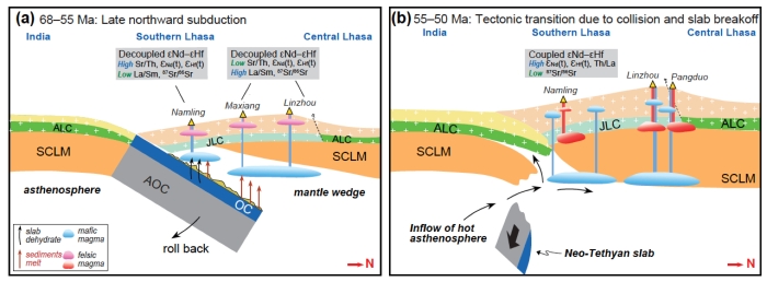 (4)Group 1样品可以被解释为新特提斯洋晚期俯冲的产物,Group 2样品形成于印度-亚洲大陆初始碰撞阶段(图5)。在约51 Ma观察到的全岩Nd-Hf同位素和锆石Hf同位素变负的现象,其成因需要根据样品与印度河-雅江缝合带的不同距离来区别的解释。