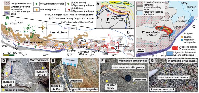 针对上述研究难题,我校“岩浆作用与青藏高原形成”研究团队博士后易建康,在合作导师朱弟成教授与澳大利亚莫纳什大学Roberto F. Weinberg教授的共同指导下,对青藏高原南部冈底斯岩浆带东段米林地区的中-酸性混合岩化正片麻岩和花岗岩岩体(扎绕岩体)开展了详细的野外、岩石学、年代学和地球化学研究,取得以下新认识: