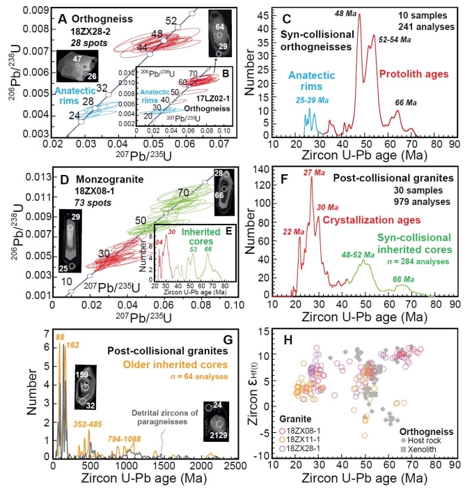 (1)米林地区的中-酸性正片麻岩发育大量淡色体,部分样品见指示后期部分熔融的转熔石榴石(图1),锆石结构和大量年龄数据显示同碰撞(66-48 Ma)中-酸性正片麻岩在碰撞后渐新世(30-25 Ma)发生了重熔(图2)。