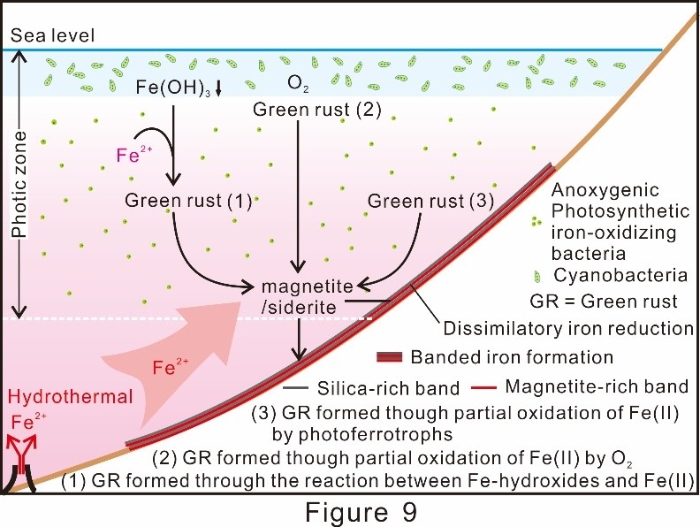 (2)由于绿锈是一种混合价态的铁盐,它们的出现表明在大氧化事件之前的海水中存在铁的氧化还原循环(图2);混合价态的富铁矿物(绿锈/磁铁矿)与之前报导的氧化态(如铁氢氧化物)和还原态(如铁蛇纹石)富铁矿物共同构成了前寒,武纪BIF的重要原生富铁矿物类型;