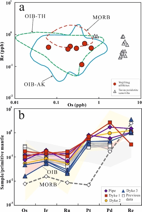 图1 瓦吉里塔格方解霞黄煌岩全岩Re-Os含量(a)及原始地幔标准化高度亲铁元素配分图解(b)