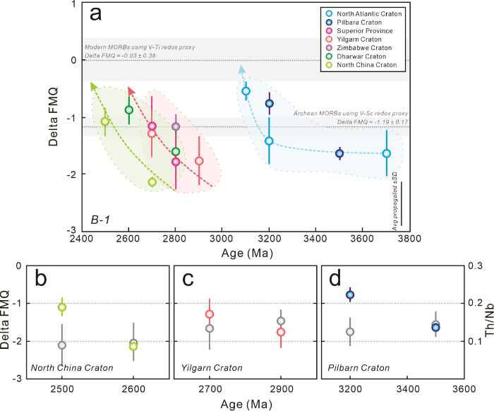 针对这一问题,我校地球科学与资源学院青年教师高磊、北京大学地球与空间科学学院刘树文教授与国内外多家单位合作,采用最新建立的V-Ti氧逸度计分析了全球14个太古宙克拉通中2304个约3.8-2.5 Ga幔源玄武岩相对氧逸度的大小。研究结果显示:(1)太古宙环境地幔(以B-1系列玄武岩为代表)和改造地幔(以B-2系列玄武岩为代表)的氧逸度差异显著但均比现今值低;(2)大多数太古宙克拉通的环境地幔和改造地幔均经历了明显的分区域氧化过程(大致可以分为3个克拉通组),氧逸度普遍增加了约1.0个log单位;(3)地幔氧逸度的变化与玄武岩Th/Nb比值及Nd同位素比值的变化密切相关,指示地壳再循环对地幔氧化的贡献(图1和图2)。