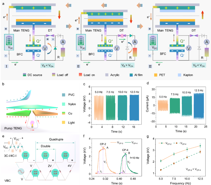 步入5G和万物互联的物联网时代,各种分布式传感器、可穿戴电子设备愈加普及,长期稳定的电能供给成为产业发展面临的关键技术挑战。作为一种新兴低频机械能量高效收集技术,摩擦纳米发电机(TENG)被认为是一种环境友好、极具潜力的低功率分布式能源需求的解决方案。但早期的TENG技术受制于摩擦介电材料的表面电荷密度较低,静电感应电流有限,输出性能有待提高等。为了提高表面电荷密度,传统方法集中在材料种类选择、介电薄膜表面改性、发电结构优化以及工作环境控制等方面,但其对电能输出的提升有限。最近兴起的电荷泵技术有望突破其瓶颈,进一步提高其输出性能,然而大多数的电荷泵技术都采用同模式的泵、主TENG,同时两者间为同步耦合运动关系,这一方面降低电荷的产生、存储与转移效率,另一方面介电材料间持续性地接触摩擦,增加磨损缩短使用寿命。因此,探索新的电荷密度增强机制与方法具有重要的科学研究意义和应用价值。