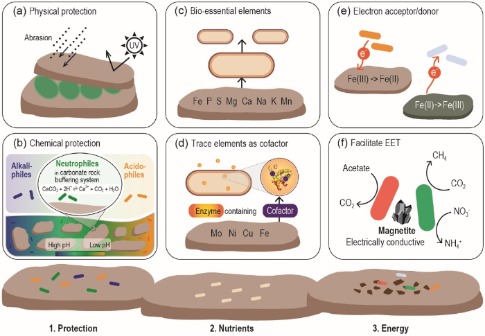 图1. 矿物对微生物的物理、化学保护作用(a & b),为微生物提供关键生命元素和重要金属元素(c & d),同时也可为微生物直接提供能量或帮助微生物传递能量(e & f)